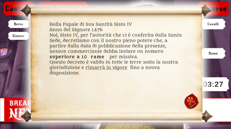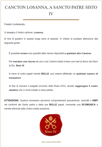 Epistolarum is a resource management game set in 1476 played through e-mail. Players must start the game and prepare themselves by sending a blank e-mail to papa.sisto.quarto[at]gmail.com. All players must receive a confirmation email from the Pope before they can click ‘Start’ to begin.